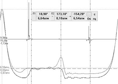 На графике достоверно можно видеть только начало открытия и закрытия выпускного клапана. Начало открытия и закрытия впускного клапана определить трудно. Этот период можно лишь приблизительно оценить. Закрывается впускной клапан после НМТ. После закрытия начинается рост давления в цилиндре. Начало открытия впускного клапана можно видеть (приблизительно) на больших оборотах двигателя, когда четко обозначен режим продувки.