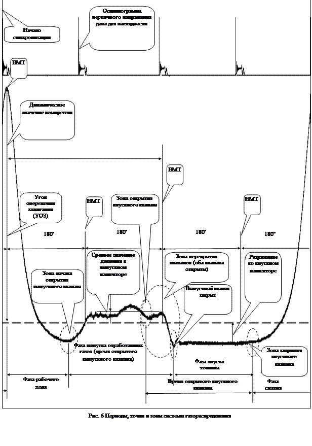 Момент открытия впускного и закрытия выпускного клапана отстоит от ВМТ на определенном расстоянии (например, ±20°для двигателя ЗМЗ-4062 - это справочная информация). Это значит, что впускной клапан открывается на 20° раньше ВМТ, а выпускной клапан закрывается на 20° позже ВМТ. На графике середину зоны перекрытия можно определить по началу спада давления после фазы выпуска.