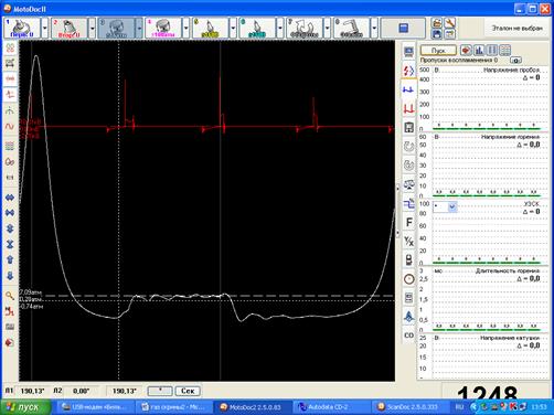 Уже с первого взгляда видно, что сигнал третьего и второго цилиндра заметно отличается от всех остальных. Это вызвано тем, что на свече имеется нагар, из-за которого происходит утечка напряжения в момент продолжительности искрового разряда. И по напряжению пробоя зазора свечи первого цилиндра можно судить о недостаточной компрессии в нем.