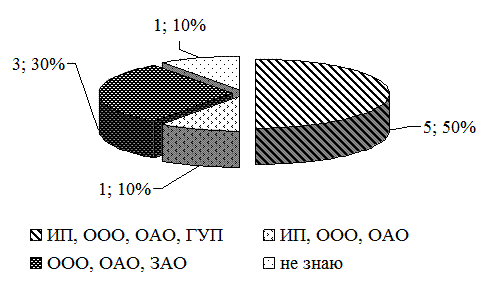 Опрос владельцев и руководителей турфирм показал, что основная масса предпринимателей знает только 2 организационно-правовые формы – ООО и ОАО, что свидетельствует о невысокой юридической грамотности руководителей турфирм г.Нефтекамска.