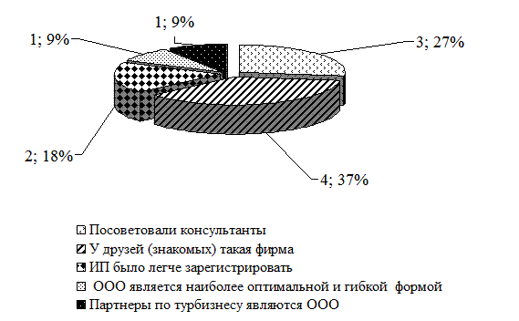 Так, владельцы шести фирм – ООО – отметили такое преимущество данной организационной формы, как более быстрая выдача кредитов данным организациям и владельцы трех ООО отметили, что данная форма, на их взгляд, дает больше возможностей сотрудничества с юридическим лицами.