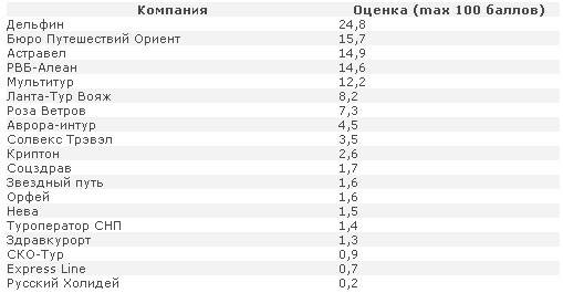 Который год по итогам рейтинга туроператоров «Ударник Туристического Труда-2009», проводимого инфогруппой «ТУРПРОМ», мы занимаем первое место: www.tourprom.ru (см раздел «Россия»). Оценивали туроператоров турагентства из всех регионов страны. Всего на приглашение поучаствовать в составлении рейтинга откликнулись 2815 представителей турфирм.