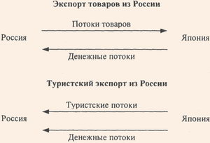 Итак, туристский экспорт - это вывоз из страны туристских впечатлений, который сопровождается одновременным ввозом туристом денег в данную страну. Туристский импорт - это ввоз в страну туристских впечатлений, который сопровождается одновременным вывозом туристом денег из данной страны. Рис. 1.1. наглядно иллюстрирует данный подход. Когда туристы из России совершают путешествие в Японию, это становится туримпортом в экономику России. Деньги японских туристов, потраченные в России, являются туримпортом для японской экономики.