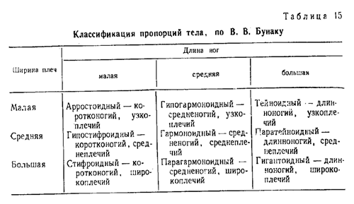 В настоящее время широко используется классификация пропорций тела В.В. Бунака (1937), в которой выделены девять типов пропорций тела по соотношению двух признаков: длины ног и ширины плеч. Эти типы обозначаются как арростоидный – слабосильный, тейноидный – длинный, стифроидный – плотный, крепкий (табл. 15).