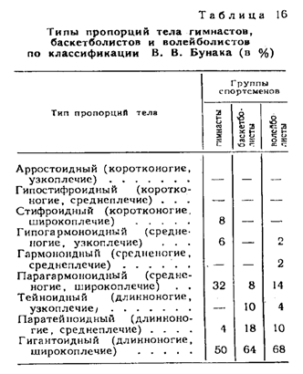 Соответственно классификации В.В. Бунака, среди гимнастов, баскетболистов и волейболистов встречаются спортсмены с различным типом пропорций тела, при этом наиболее часто отмечается гигантоидный тип (табл. 16).