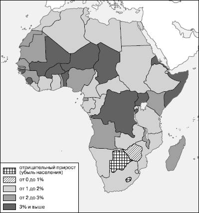 Основой для продолжения этого анализа на уровне отдельных стран может послужить рисунок 1. При его рассмотрении нетрудно заметить, что ныне в Африке уже более половины стран имеют среднегодовой темп прироста населения от 1 до 2 %. Но в 13 странах он все еще составляет 2–3 %, а в 12 странах– 3–4 %. Больше всего таких стран в Западной, но они есть также в Восточной и Центральной Африке. Кроме того, за последнее время в Африке появились страны, в которых происходит не рост, а убыль населения. Это объясняется эпидемией СПИДа[8].