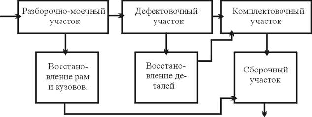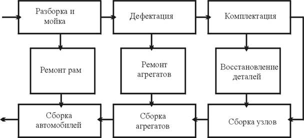 Производственный процесс капитального ремонта автомобилей включает технологические, энергетические, транспортные, складские и др. операции, обеспечивающие выпуск готовой продукции.