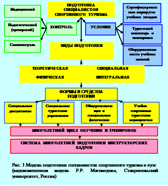 В нашем курсе лекций мы рассматриваем не спонтанный, а научно и методически обоснованный процесс обучения спортивно-туристской и рекреационно-туристской деятельности в рамках подготовки общественных и профессиональных туристских кадров. В частности в Белорусском университете физической культуры такое обучение проводится на специальности 1-89 02 01 «Спортивно-туристская деятельность» по направлениям 1-89 02 01-01 «Спортивный и рекреационный туризм» и 1-89 02 01-02 «Менеджмент в туризме». Интегральная подготовка – совершенствование умений и навыков владения туристской техникой, приобретение необходимого туристского опыта учащихся непосредственно в условиях туристского похода или на туристских соревнованиях является непременным компонентом обучения на данных направлениях специальности (Рис. 1). В данном случае процесс обучения в походных условиях (в условиях туристских соревнований) специально планируется и такие мероприятия носят определение «учебно-спортивные туристские мероприятия» (УСТМ).