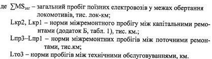 1.9 Програма ремонту поїзних і маневрових локомотивів визначається окремо за серіями локомотивів і видами руху. Програма технічного обслуговування і ремонту електровозів у вантажному русі розраховується згідно з загальним пробігом у межах обертання локомотивів і встановленими нормами пробігу між технічним обслуговуванням і ремонтами за формулами: