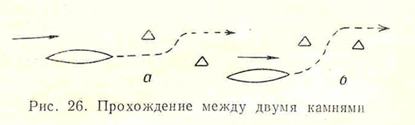 В случае если два камня расположены один за другим на одной линии, приходится начинать тот же маневр при прохождении около первого и лишь позднее поворачивать по течению. В этом случае, поровнявщись скулой судна с камнем, надо «прижиматься» к нему, т. е. проходить возможно ближе (рис. 26, б).