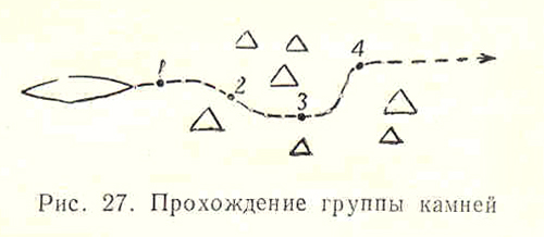 Препятствие из трех подводных камней. Возьмем тот случай, когда камни образуют треугольник. Здесь приходится применять и комбинировать технику прохождения, описанную выше (рис. 27).