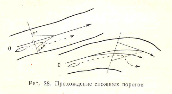На порогах больших рек нет серьезной опасности налететь на подводные камни, расположенные в стороне расчищенного русла главного потока. Как правило, большие камни можно заметить, а мелкие убраны с дороги силами воды. Выйдя из главной струи, приходится пробираться между отдельными камнями (рис. 28).