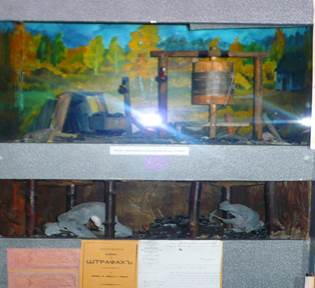 Здесь вы видите фотографию, как кольчугинские шахтеры впервые отметили первомайский праздник сходкой. На этом стенде вы можете увидеть, служащих царской семьи, а также уникальные предметы: перо, чем раньше писали, и кстати говоря у писарчуков был достаточно красивый почерк; и первую печатную машинку «Континенталь», ведь в то время не было компьютеров, как сейчас у нас с вами. Первый телефонный аппарат «Азбука Морзе», он располагался на железнодорожном вокзале и в рудничном клубе, при помощи этого аппарата получали сообщения.