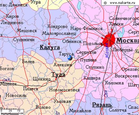 Сегодня Таруса – административный центр Тарусского района Калужской области (Приложение 1) . Город расположен у впадения реки Тарусы в реку Ока, в 130 км от Москвы, 36 км от Серпухова, в 70 км от Калуги. Население – 9, 7 (2005 год), основан в 1246 году, город – 1776.Таруса – культурный и научный центр северо-востока Калужской области и юго-запада Подмосковья. В историю мировой культуры Таруса вошла под названием Русский Барбизон.