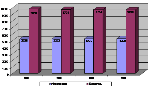 ДИАГРАММА 1.1. Динамика численности населения Финляндии и РБ в 2005-08 гг., тыс. чел.