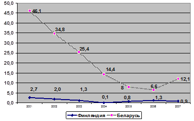 ГРАФИК 1.2. Уровень инфляции в Финляндии и Республике Беларусь в 2001-2007 гг., в %