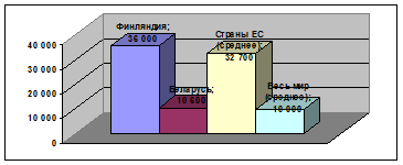 ДИАГРАММА 1.3. ВВП на душу населения (по ППС) Финляндии и Республики Беларусь в сравнении с странами ЕС и всего мира в 2007 г., долл.