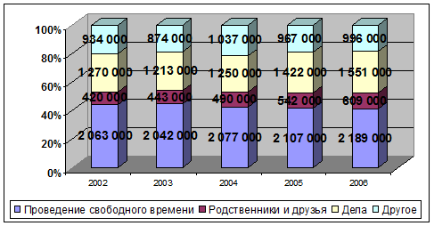 ДИАГРАММА 2.2. Прибытия в Финляндию по целям поездки в 2002-2006 гг., чел.