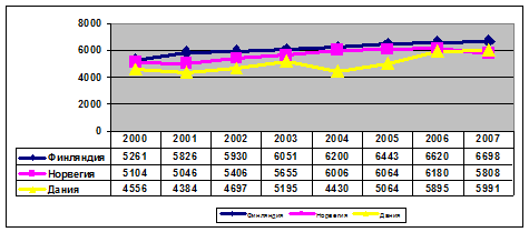 ГРАФИК 2.1. Прибытия в Финляндию на фоне Дании и Норвегии в 2000-2007 гг., тыс. чел.