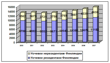 ДИАГРАММА 2.3. Количество ночевок в отелях и аналогичных средствах размещения резидентами и нерезидентами Финляндии в 2000-2007 гг., тыс. чел.