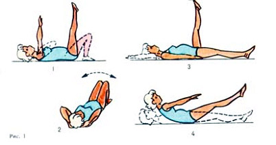 И. п. - лежа на спине, руки вдоль туловища. Приподнимите обе ноги и, одновременно приподняв плечи, потянитесь руками к пальцам стоп. Вернитесь в и. п. Женщинам со слабыми мышцами живота это движение сначала покажется трудным, но с нарастанием тренированности все сложности исчезнут, и можно будет довести количество повторений до 20-25 раз в среднем темпе, без задержки дыхания (рис. 1,г).