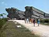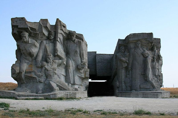 Ну, вот мы и приближаемся к музейному комплексу в каменоломнях Аджимушкая. Мемориальный комплекс «Аджимушкайские каменоломни» расположен в 5 км северо-восточнее города Керчь, в поселке Аджимушкай. В него входят: подземная экспозиция музея героической обороны Аджимушкайских каменоломен (май-октябрь 1942 г.), мемориальный ансамбль при входе в подземную экспозицию и братские могилы на поверхности.
