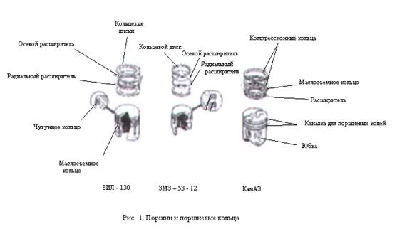 Лабораторная работа № 2 Тема: Поршневая группа и шатуны. Цель: Изучить механизмы и устройства кривошипно-шатунного механизма. Ход работы: Кривошипно-шатунный механизм (КШМ)) воспринимает давление газов при такте сгорания- расширения и предназначен для преобразования прямолинейного, возвратно-поступательного движения поршня во вращательное движение коленчатого вала. КШМ состоит из блока цилиндров с картером, головки цилиндров, поршневой группы, маховика, поддона картера. Блок цилиндров является основной деталью двигателя, к которой крепятся все механизмы и детали. Цилиндры в блоках изучаемых двигателей расположены V- образно в два ряда под углом 90 градусов. Блоки цилиндров отливают из чугуна (ЗИЛ-130, КамАЗ) или алюминиевого сплава(ЗМЗ-53-12). В той же отливки выполнены картер и стенки полости охлаждения, окружающие цилиндры двигателя. В блоках изучаемых двигателей устанавливают вставные гильзы, омываемые охлаждающей жидкостью. Внутренняя поверхность гильзы служит направляющей для поршня. Гильзы, омываемые охлаждающей жидкостью называются мокрыми . В нижней части они имеют уплотняющие кольца из специальной резины или медные. Блок цилиндров V-образного двигателя ЗИЛ-130 и ЗМЗ-53-12 сверху закрыт двумя головками из алюминиевого сплава. В двигателе КамАЗ-740 каждый цилиндр имеет свою головку. На головке цилиндров закреплены детали ГРМ. В головке цилиндров выполнены впускные и выпускные каналы и установлены вставные седла и направляющие втулки клапанов. Для создания герметичности между блоком и головкой цилиндров установлена прокладка, а крепление головки к блоку цилиндров осуществлено шпильками с гайками. Прокладка должна быть жаропрочной и эластичной. В двигателе ЗИЛ-130 и ЗМЗ-53-12 она сталеасбестовая, в КамАЗ-740 – из стали. В двигателе ЗМЗ –53-12 гильзы цилиндров в верхней части удерживаются только головкой цилиндров, поэтому при сборке необходимо подбирать комплект медных уплотняющих колец нижней части гильзы так, чтобы гильза выступала над плоскостью разъема блока и головки цилиндров на 0.02…0,09мм. Поршень воспринимает давление газов при рабочем такте и передает его через поршневой палец и шатун на коленчатый вал. Поршень представляет собой перевернутый цилиндрический стакан, отлитый из алюминиевого сплава( рис.1).В верхней части поршня расположена головка с канавками, в которые вставлены поршневые кольца. Ниже выполнена юбка, направляющая движения поршня. В юбке поршня имеются отверстия - бобышки, для поршневого пальца. Чтобы поршень не заклинивался при прогретом двигатели, головку поршня выполняют меньшего диаметра, чем юбку, а саму юбку в поперечном сечении изготавливают не цилиндрической формы, а в виде эллипса. На юбке поршня может разрез. Благодаря овальной форме и разрезу юбки предотвращается заклинивание поршня при работе прогретого поршня. Поршневые кольца , применяемые в двигателях, подразделяются на компрессионные и маслосъемные. Компрессионные кольца уплотняют зазор между поршнем и цилиндром и служит для уменьшения прорыва газов из цилиндров в картер, а маслосъемные снимают излишки масла с зеркала цилиндров и не допускают проникновения масла в камеру сгорания. Кольца, изготовленные из чугуна или стали, имеют разрез (замок) (рис.1). При установки поршня в цилиндр поршневое кольцо предварительно сжимают, в резу