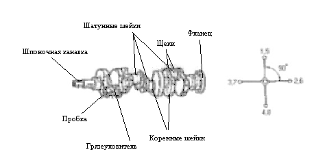 Коленчатый вал воспринимает усилие, передаваемые от поршней шатунами, и преобразует их в крутящий момент, который затем через маховик передается на транс миссию. В двигателях ЗИЛ-130 и КамАЗ-740 коленчатый вал стальной, а в ЗМЗ-53-12 – отлит из высокопрочного чугуна. Коленчатый вал (рис. 3 ) состоит из шатунных и коренных шеек, щек и противовесов. На переднем кольце вала двигателей ЗМЗ-53-12 и ЗИЛ-130 имеется углубление для шпонки распределительной шестерни и шкива привода вентилятора, а также нарезное отверстие для крепления храповика, задняя часть вала выполнена в виде фланца, к которому болтами прикреплен маховик. Шатунные шейки коленчатого вала многоцилиндровых двигателей выполнены в разных плоскостях, что необходимо для чередования рабочих тактов в разных цилиндрах. В восьмицилиндровых V- образных двигателях коленчатые валы имеют по четыре шатунные шейки, расположенные под углом в 90 градусов.