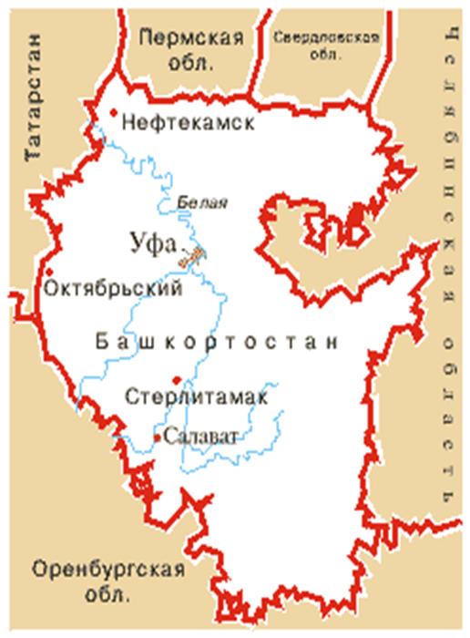 Республика Башкортостан расположена на Южном Урале на стыке Европы и Азии и занимает центральное географическое положение в Российской Федерации. На западе Башкортостан граничит с Республикой Татарстан, на северо-западе - с Удмуртской Республикой, на севере - с Пермской и Свердловской, на востоке - с Челябинской, на юге - с Оренбургской областями.