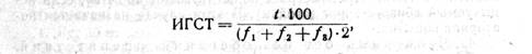 гдеt—фактическоевремявыполненияфизическойнагрузкивсекундах; fbf2, fa—суммапульсазапервые 30 скаждойминуты (начинаясо 2-й) восстановительногопериода. Величина 100 необходимадлявыраженияИГСТвцелыхчислах, ацифра 2 —дляпереводасуммыпульсаза 30-секундныепромежуткивремени вчислосердцебиенийзаминуту.