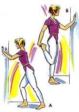Б. Станьте на правую ногу, слегка согнув ее в колене. Левой ногой свободно покачивайте, как бы описывая ею круги. Затем выполните то же упражнение, сменив положение ног. Повторите.
