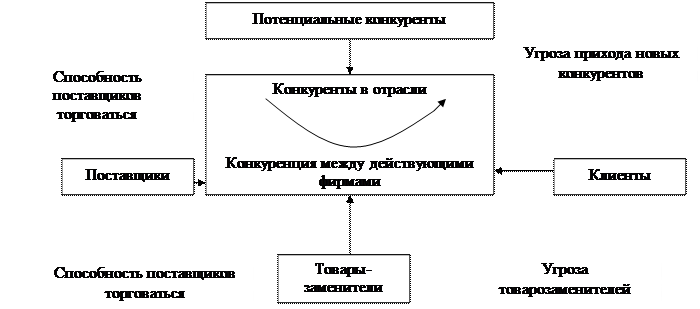 Суть конкуренции выражают единой аналитической концепцией, используемой для выявления природы и оценки интенсивности конкуренции. Согласно исследованиям известного английского ученого, авторитета в области конкуренции М.Е. Портера состояние конкуренции на определенном рынке можно охарактеризовать 5 конкурентными силами (рис. 1).