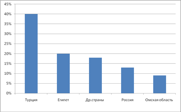 Чтобы выявить предпочтения омичей мы пересмотрели базу данных турфирмы, а также опросили персонал турфирмы. Был разработан план интервью, который включал следующие вопросы: сколько человек в день обслуживает турфирма, какие направления в основном выбирают, какой ценовой сегмент они выбирают. Получив ответы на все интересующие нас вопросы, и добавив к этому результаты изучения базы данных, мы получили ответ нашего исследования. Наиболее популярными маршрутами омских туристов являются Турция и Египет. Далее следует Россия, омская область и другие страны. Результаты не были неожиданными, поскольку туры в эти страны являются самыми доступными. И такая тенденция прослеживается в целом по России. Полностью результаты исследования приведены в диаграмме.