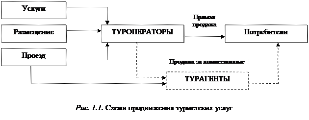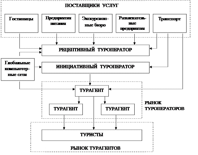 Функции туроператора на рынке практически совпадают с деятельностью предприятий оптовой торговли. Он закупает в значительных объемах услуги предприятий туристской индустрии (гостиниц, ресторанов и т. д.), комплектует из них собственные программы туров и осуществляет их реализацию через посредников (турагентов) или напрямую потребителям (рис.1.4)