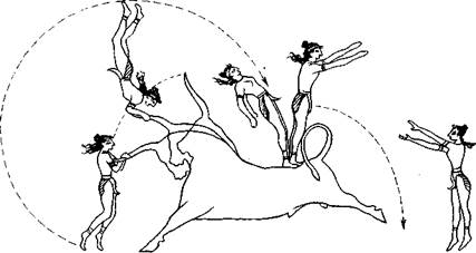 Несколько фаз акробатической игры с быком, изображенной на настенной росписи в Кносе (II тысячелетие до н. э.)