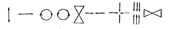 Зрительно-двигательные траектории, используемые в вышеперечисленных упражнениях: стрелка по вертикали, по центру, по горизонтали, по овалу по часовой стрелке, и по второму овалу против часовой стрелки. Внутри из центра проводиться восьмерка по часовой стрелке. Получается пять линий, по которым ребенок ведет глазами вверх, вниз, влево и вправо; чем медленнее он это делает, тем лучше.