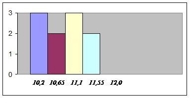 6. Построение гистограммы . Так как исследуется выборка малого объема 10,20; 10,30; 10,50; 11,0; 11,2; 11,8; 12,0; 11,5; 10,9; 11,3, выбираем число интервалов К=4.