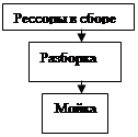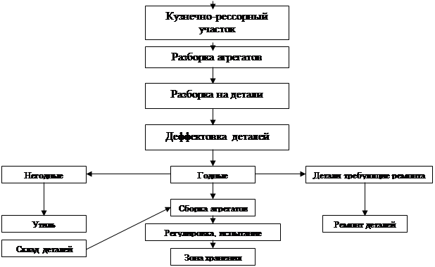 Деталь поступает на участок, ее разбирают, при необходимости моют, затем отправляют на дефектовку. После этого детали сортируют, негодные отправляют в утиль, детали требующие ремонта ремонтируют, годные детали отремонтированные, а также новые или изготовленные самостоятельно, поступают на сборку и испытание.