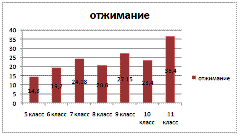 3. Измеряя уровень силовых показателей учащихся 5-11 классов общеобразовательных школ 11 и 9 г.Шуи, сравнивая их с учебными нормативными по усвоению навыков, умений, развитию двигательных качеств по предмету физкультура в российских школах на учебный год 2008/2009 гг., необходимо отметить что юноши в школе №11, в тесте «отжимание» на «5» баллов, показали свои результаты 5, 6, и 11 класс, все остальные на «4» балла. В тесте «подтягивание» результаты хуже. На «5» баллов показал результат, лишь 11 класс, на «4» результат был в 5, 9, 10 классе, 6, 7 класс показал на «3» балла, 8 класс явно выпадает из положительного результата, показав результат лишь на «2» балла.