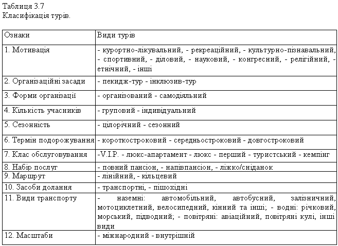 Основним продуктом споживання ринку туристичних послуг є тур. Тур - це комплекс туристичних благ, послуг та товарів, представлений у вигляді програми, складеної з урахуванням індивідуальних побажань, в межах якої реалізується мета перебування людини поза постійним місцем проживання, і комплекс заходів по її реалізації на відповідному якісному рівні. Тури поділяються на види відповідно до мети подорожі та форми щодо організаційних заходів, класифікуються за кількістю учасників, сезоном та терміном перебування (таблиця 3.7).