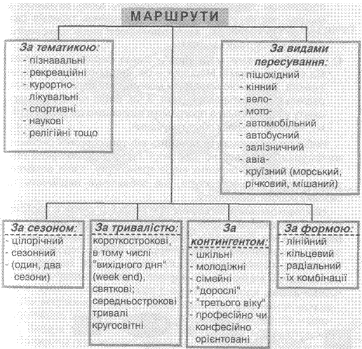 Залежно від комплекса послуг та комфортності подорожування тури поділяються на класи обслуговування. Мотивація подорожі та її комфортність визначають програму туру. За формою тури поділяються на комплексні та індивідуальні. Індивідуальний тур («інклюзив-тур») передбачає забезпечення подорожування відповідно до побажань туриста. Комплексний тур («пекидж-тур») формується туристичною фірмою, включає певний набір попередньо узгоджених з туристом послуг, вартість яких сплачується в повному обсязі. Тур є ринковим продуктом туристичних підприємств, формою, яку набуває споживання послуг, матеріальних і нематеріальних благ, заходом, який реалізує мету подорожування і в той же час результатом діяльності турфірми, джерелом ЇЇ прибутку. Складовими туру є маршрут, програма та комплекс послуг по життєзабезпеченню туриста, в межах яких реалізується на відповідному якісному рівні мета подорожування. Маршрут і програма забезпечують мету подорожування, а міроприємства з життєзабезпечення туриста під час подорожування - безпеку та комфортність при реалізації цієї мети. Тури, які розробляються туроператорами, повинні відповідати таким принципам. безпека (всіх складових і на всіх етапах проходження туру); комфортність (задоволення життєвих потреб у проживанні, харчуванні, транспортуванні та інших послугах на рівні по можливості не нижчому за рівень у постійному місці проживання), тобто забезпечення якісного обслуговування під час подорожування; достатність послуг, що пропонуються для задоволення потреб туриста під час подорожі, для реалізації мети подорожі; категоріальна відповідність (всі складові тура повинні відповідати заявленому класу обслуговування); конкурентоздатність (забезпечення прибутковості в діяльності турфірми) Вибір форми турпродукту визначається метою та видом подорожі. Відповідно тури поділяють на рухомі, що передбачають інтенсивне пересування з максимально можливим охопленням об'єктів показу та стаціонарні, що передбачають більш спокійний відпочинок з обмеженими виїздами. За цим критерієм тур може формуватися у формі маршрутно-транспортного чи маршрутно-стаціонарного (мал. 3.8).
