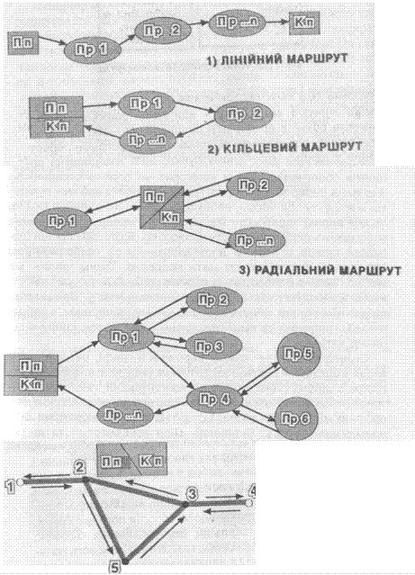 Розробка туру включає такі етапи: 1) вибір пунктів маршруту - критерієм відбору є атрактивність об'єктів показу для задоволення мети подорожі, можливість забезпечити різноманітність програми перебування в даному населеному пункті, його транспортна доступність та забезпеченість послугами гостинності; ієрархізація зазначених пунктів - за зазначеними критеріями з акцентацією на рівні гостинності та транспортної доступності виділяють пункти дислокації з тривалим програмним забезпеченням та екскурсійні пункти; вибір початкового та кінцевого пунктів маршруту – за показником транспортної доступності, тобто зв'язністі з місцем постійного проживання потенційних туристів (зоною дії туроператора), взаємозамінності видів транспорту, типу транспортних засобів; розробка схеми маршруту - схема маршруту залежить від обраної форми. Маршрут - це напрямок переміщення туриста. За схемою маршрути можуть бути лінійні, кільцеві, радіальні та комбіновані, (мал. 3.10).