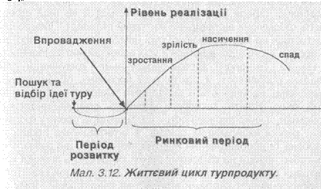 Концепція життєвого циклу турпродукту дозволяє краще зрозуміти і оцінити динаміку впровадження та позиціювання товару, його конкурентоздатність, місце на ринку, виробити відповідну маркетингову політику. Таким чином, основним ринковим продуктом туристичної фірми на ринку туристичних послуг є комплексний продукт - тур або окремі його складові (транспортне обслуговування, включаючи бронювання та продаж квитків, екскурсійне обслуговування тощо). Туристичне підприємство організує споживання туристичного продукту шляхом укладання партнерських угод з обслуговування туристів. Діяльність туристичного підприємства спрямована на розробку та реалізацію такого туристичного продукту, який би за своїми якісними властивостями та ціною задовольняв потреби населення в змістовному відпочинку.