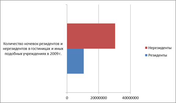 Пропорционально количеству прибытий (отъездов) в первой половине 2009 года сокращалось и число ночевок туристов в гостиницах и подобных учреждениях, по сравнению с аналогичным периодом 2008 года. Данные по всем направлениям внутреннего и международного туризма принципиально не отличаются от данных таблицы 1.