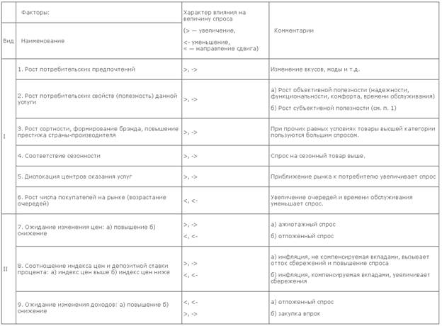 Обзор современных исследований, посвященных анализу функций спроса, свидетельствует о явно недостаточном внимании к исследованию сферы услуг, в то время как деятельность этой сферы самым непосредственным образом зависит от прогноза спроса. Что же касается набора факторов, используемых в этих функциях, то в большинстве работ такими детерминантами спроса по-прежнему являются цена и доходы, а влияние прочих (неденежных, неценовых факторов) учитывается константой. Это обусловлено, с одной стороны, известным консерватизмом мышления, с другой – наблюдаемой в изменчивостью доходов и цен. Эта изменчивость в ряде случаев подавляла действие других характеристик. В то же время усиливается тенденция анализа и учета других групп параметров, влияющих на спрос, что обычно отображается соответствующим сдвигом кривой спроса относительно осей координат. В табл. 1 представлены две группы таких факторов, которые отражают влияние на рассматриваемый товар (услугу):