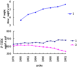 Рис. 1. Производство и потребление сигарет во всем мире и в США (по: Diana, 1993). 1 - производство, 2 - потребление.