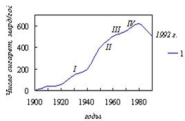 Рис. 2. Потребление сигарет в США в XX веке (по: Shopland, 1993).