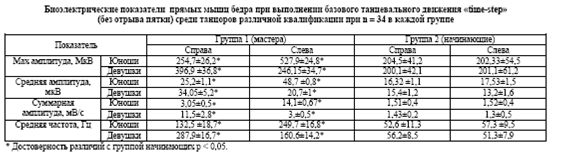 В обеих группах был проведен сравнительный анализ биоэлектрических показателей (амплитуды и частоты сокращений) прямых мышц бедра юношей и девушек при выполнении базового танцевального движения «time-step» (без отрыва пятки от пола) (таблица). При анализе полученных данных нами были выявлены неоднозначные результаты биоэлектрических показателей прямых мышц бедра справа и слева среди танцоров высокой квалификации. Выявлено, что при выполнении базового танцевального движения «timestep » максимальная амплитуда сокращения прямых мышц левого бедра у юношей значительно выше, чем у девушек, – 527,9 и 246,15 мкВ соответственно. Максимальная амплитуда сокращения прямых мышц правого бедра у девушек выше (396,9 мкВ), чем у юношей (254,7 мкВ). Подобные результаты приоритета «толчковой ноги» по половому признаку наблюдались также и среди показателей средней, суммарной амплитуды и средней частоты сокращений прямых мышц бедра.