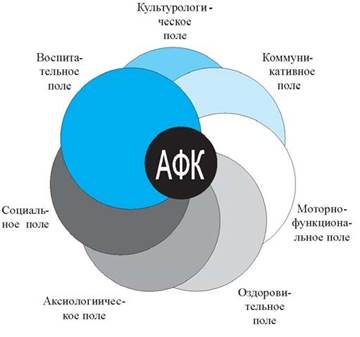 В соответствии с этим в пространстве адаптивной физической культуры можно условно выделить совокупность полей-структур, в которых совершается поведение, представляющее собой функцию личности и среды (К. Левин): культурологическое, воспитательное, коммуникативное, социальное, моторно-функциональное, аксиологическое и оздоровительное поля.