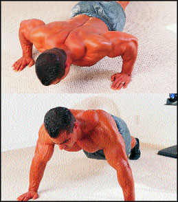 Мнение о том, что отжимания надо применять только в том случае, если под рукой нет штанг и гантелей, в корне неверно. Отжимания – это типичное базовое упражнение, которое вдобавок лишено главного качкового недостатка, надуманности. В самом деле, никто не разводит меха гармошки с весом по 50 кг на каждую руку, да и роль домкрата для нас редкая. А вот стойка на руках, вспомните, это для мужика самая что ни на есть натуральная позиция. Иногда так и тянет упасть на пол и отжаться раз тридцать просто в свое удовольствие. Другое дело, что в бодибилдинге у отжиманий своя задача. Делать отжимания надо только с целью коррекции мышечной формы. А для этого скиньте рубашку и пусть за вами кто-то понаблюдает. Отыщите такой вариант отжиманий, который “бьет” точно по вашему слабому месту. Делать отжимания ради бестолковых рекордов не стоит.